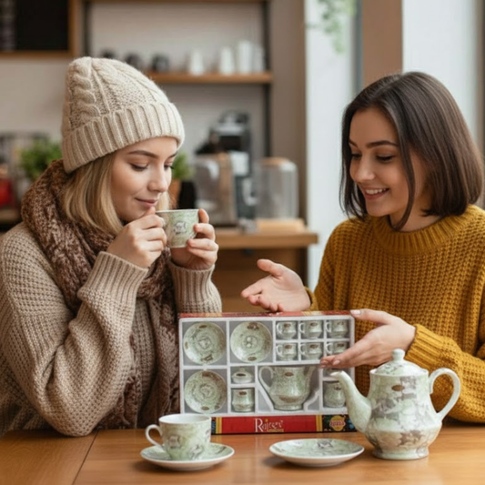 Product Name : Pista Green Kettle Set Luster Rajeev Description : 15-Piece Veg Bone China kettle set by Rajeev features an elegant tea service with a complete set of cups, saucers, and accessories, available in various artistic floral and marble-finish designs. In the Box : 15 Pieces (1 Kettle, 6 Cups, 6...