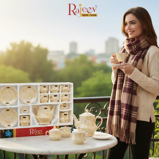 Product Name : Natural Beige Kettle Set Luster Rajeev Description : 15-Piece Veg Bone China kettle set by Rajeev features an elegant tea service with a complete set of cups, saucers, and accessories, available in various artistic floral and marble-finish designs. In the Box : 15 Pieces (1 Kettle, 6 Cups, 6...