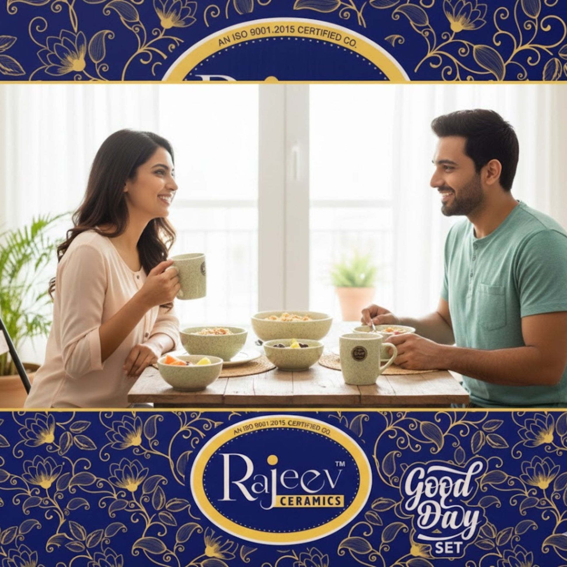 Information : Rajeev Ceramics (An ISO 9001:2015 Certified Company). Good Day Set. High-quality, durable ceramic. Features a modern, light-green speckled (granite-style) finish that adds a touch of sophistication to your kitchen. The mugs are perfect for tea, coffee, or hot chocolate, while the bowls are ideal for snacks, soup, or desserts. Made by a certified manufacturer, ensuring food-grade safety and long-lasting finish. Comes in a beautifully designed blue and gold floral box, making it an excellent choice for weddings, housewarmings, or festive gifts. The mugs feature comfortable handles for easy everyday use.
