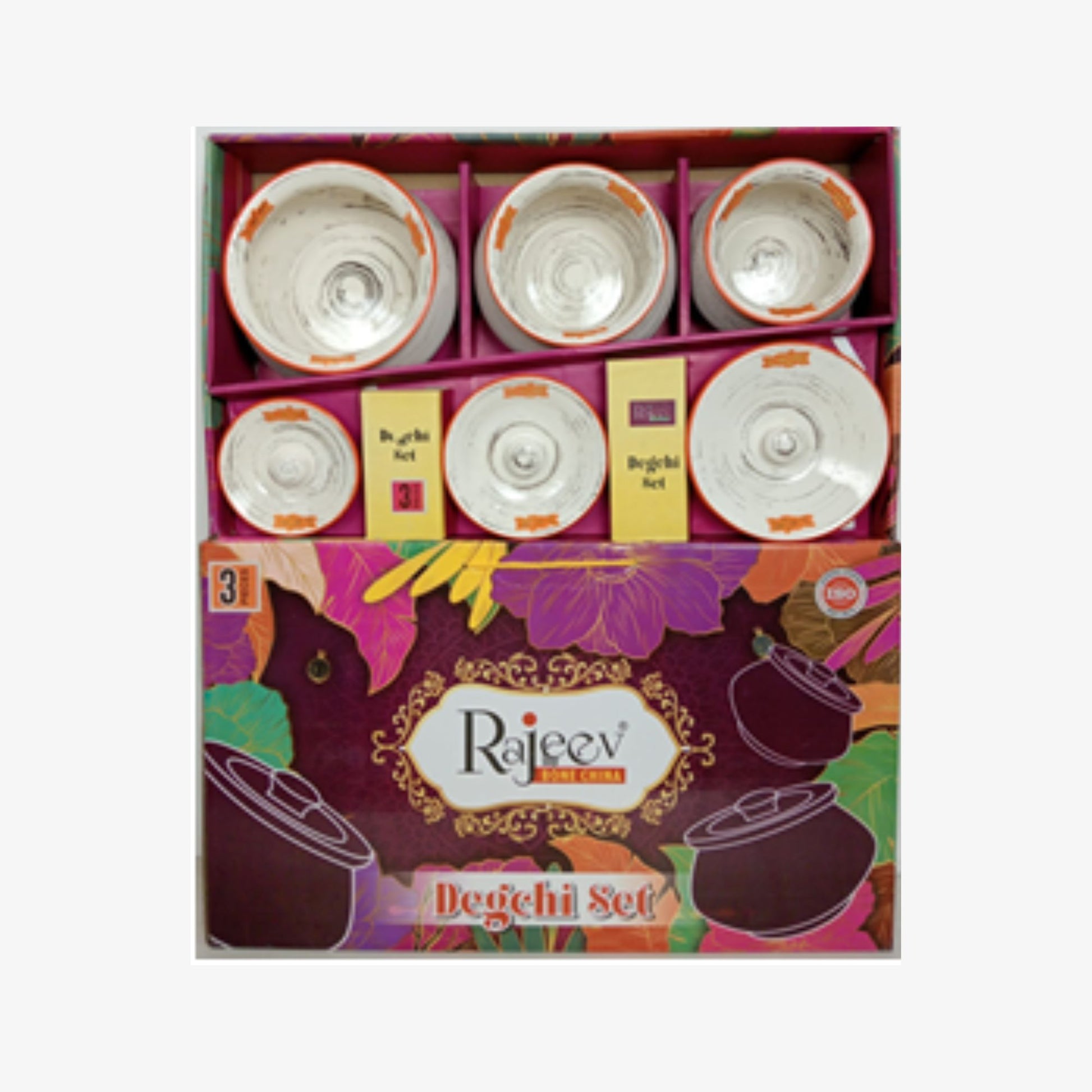 Information : Rajeev Veg Bone China, High-quality Veg Bone China (known for its translucent finish and durability). 3 Serving Degchis with 3 Matching Lids (Total 6 pieces). Features a rustic "hand-painted" brush-stroke texture with vibrant orange accents. Made from authentic veg bone china, giving it a lightweight feel and a sophisticated glossy look. Ideal for serving curries, daal, biryani, or desserts during family dinners and special occasions.Veg Bone china is non-porous and food-safe, ensuring your meals stay fresh and chemical-free.