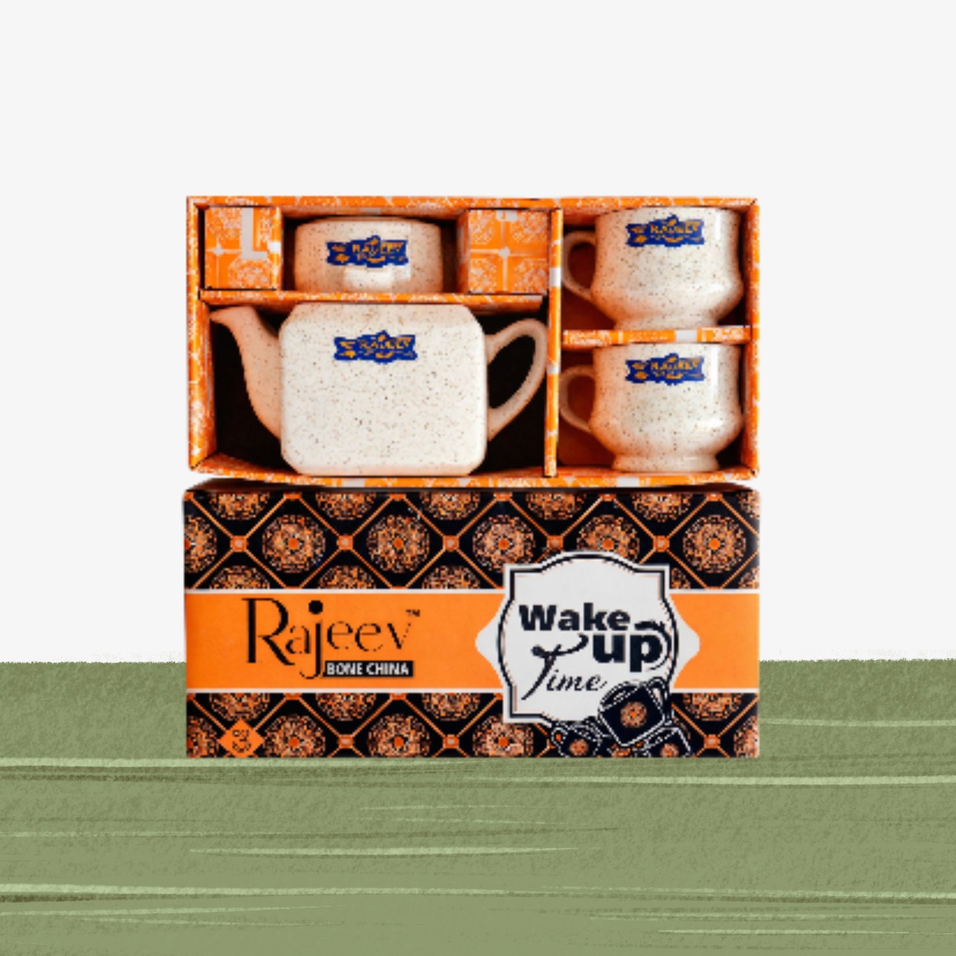Description : This premium Rajeev Wake Up Time collection is a stylish 3-piece Veg Bone China set featuring a modern speckled teapot and matching mugs, elegantly presented in a vibrant designer gift box.