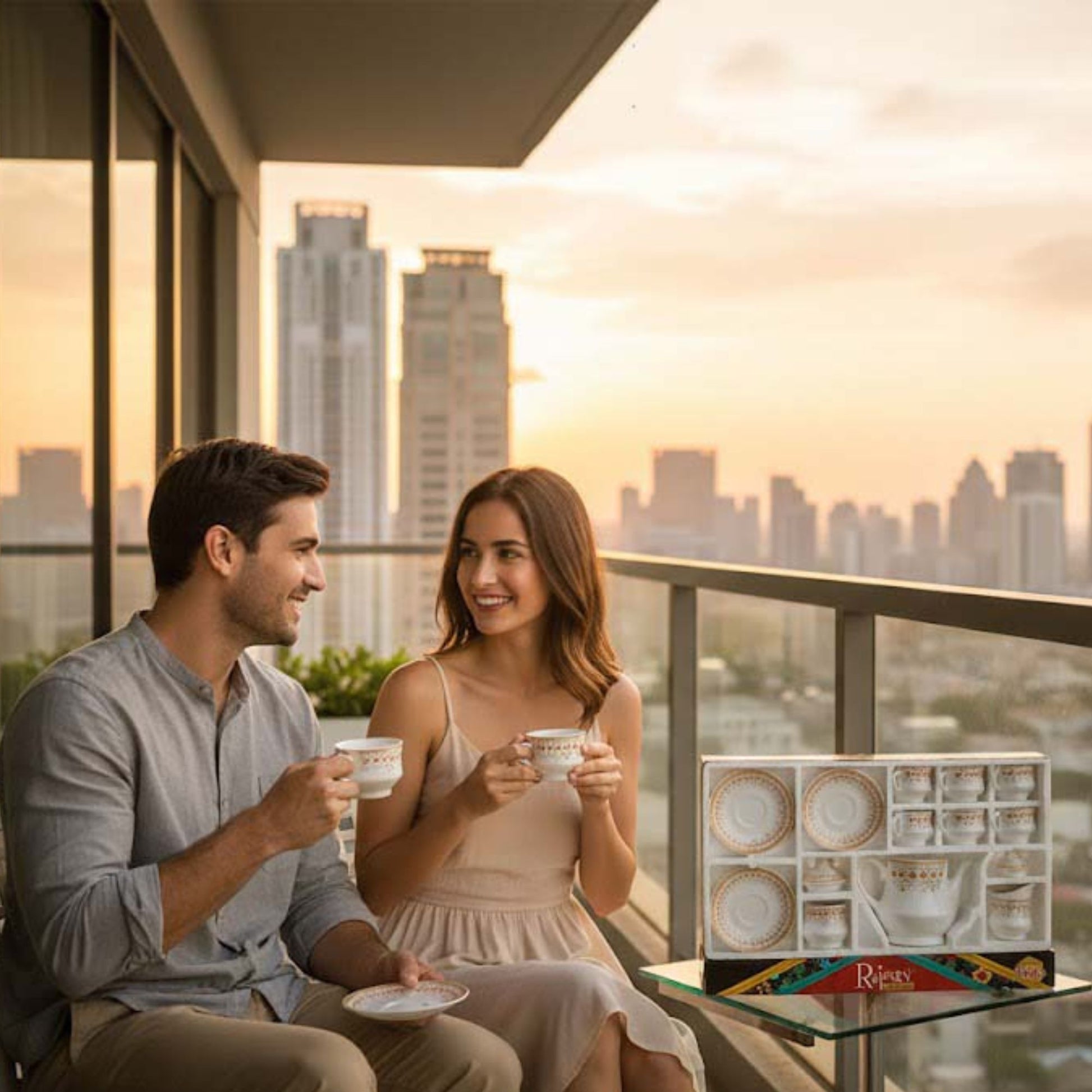Information : Rajeev Veg Bone China (An ISO 9001:2015 Certified Co.). Exclusive Kettle Set. High-quality Veg Bone China, known for its lightweight feel and high-gloss finish. This collection offers a wide range of aesthetic styles to suit any home or occasion: Elegant white bases decorated with vibrant purple, pink, or orange rose motifs. A sophisticated deep black finish accented with luxurious golden floral patterns. Trendy "granite" or marble-effect textures available in grey, green, orange, and golden-yellow shades.