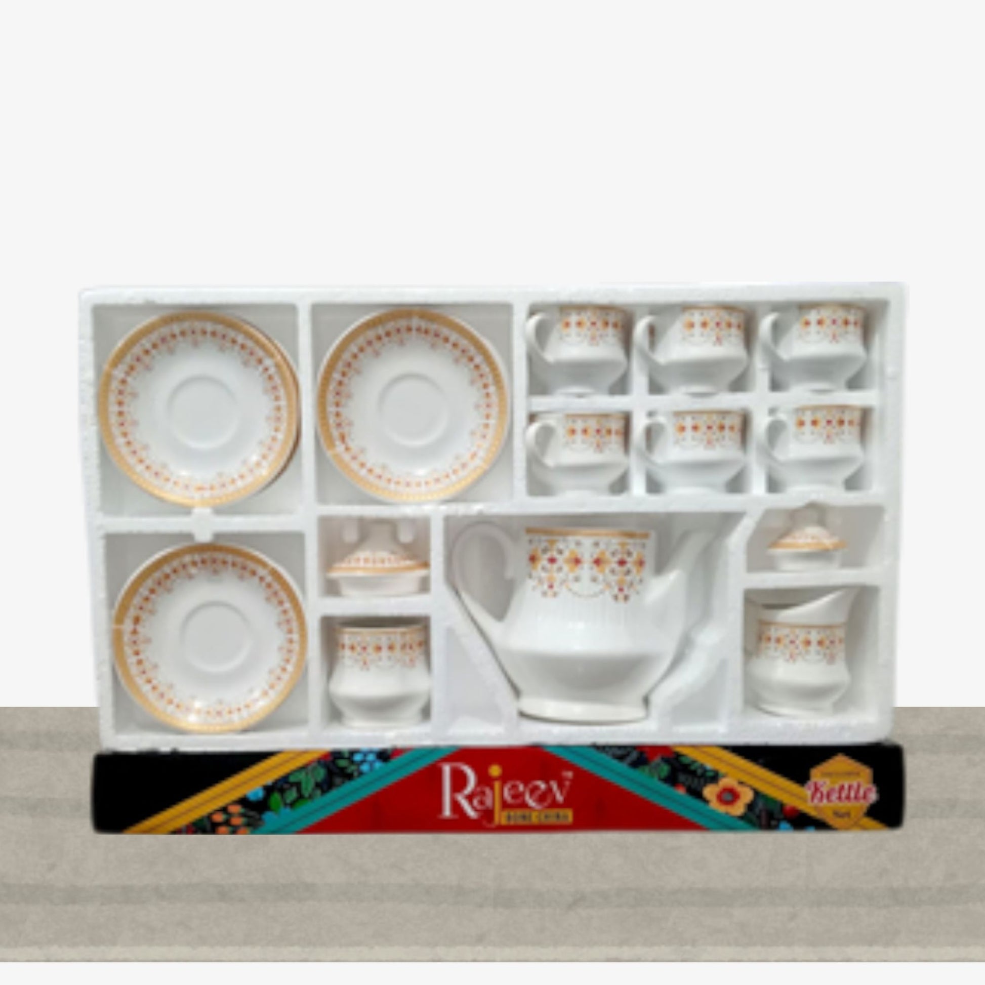 Description : 15-piece Rajeev Veg Bone China Kettle Set offers a complete, ISO-certified tea service featuring a stylish kettle, matching cups, saucers, and accessories in a variety of elegant floral and modern patterns.